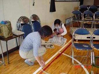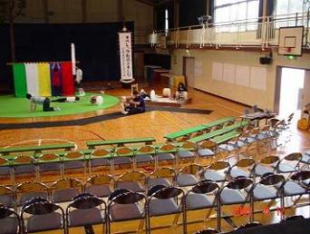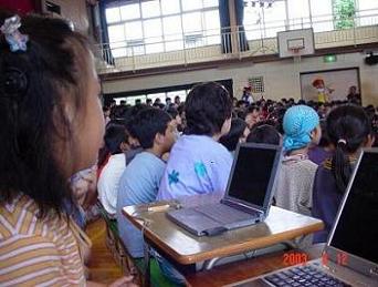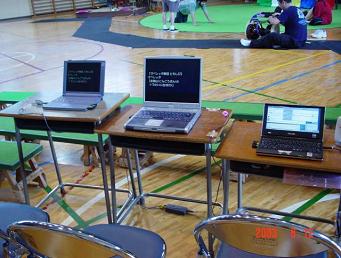 | 左上が演劇の舞台、利用者は、右のバスケットボールゴール下の椅子席です。表示用のパソコンというハードの制約で舞台から離れた席になってしまうのが残念です。 | 電源ケーブルが足に引っかからないようにテープで張ります。小学校のパソコン要約筆記は、父母や先生の理解と協力が無くては成立しません。 |