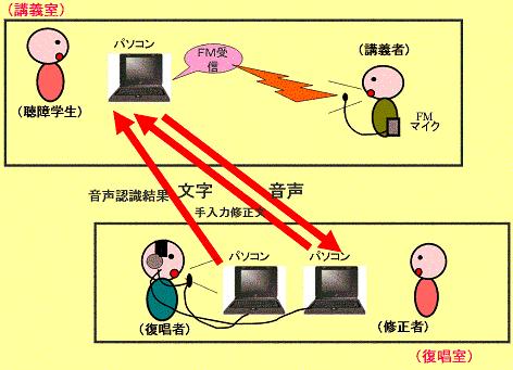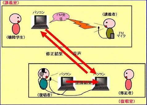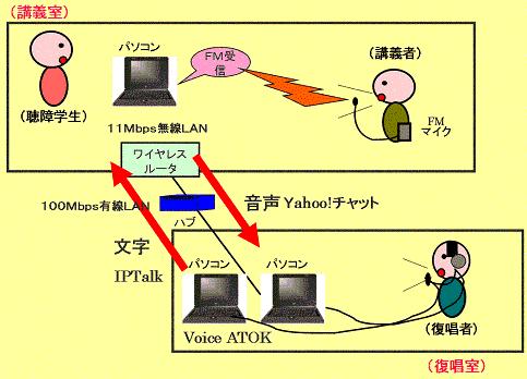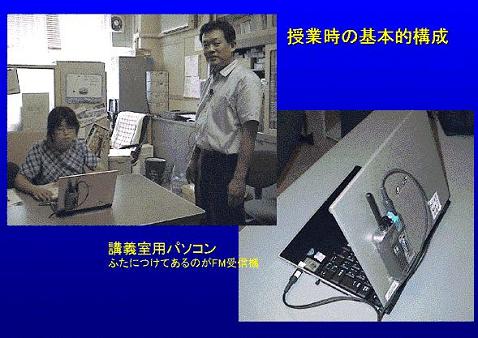 | 上の写真は、授業の様子です。 先生は、FMマイクを付けて授業をします。その音声をパソコンのフタに貼り付けられたFM受信機が受けて、Yahooメッセンジャで(インターネットで)復唱室に送ります。 復唱室で作られた字幕をIPtalkで表示します。 |