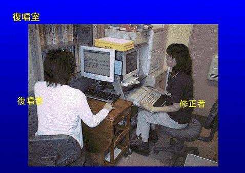 | 復唱室の様子です。 復唱者は、音声認識用ソフト「VOICE ATOK」を使って字幕を作ります。 修正者は、音声認識した字幕をIPtalkで修正します。 |
