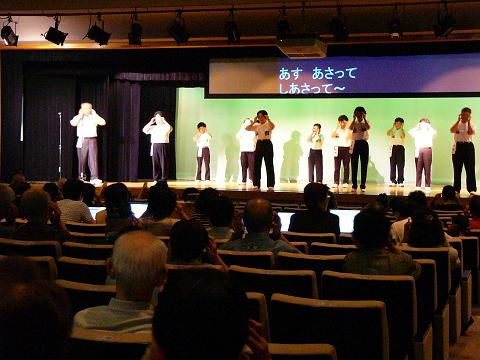| 歌体操グループ「HAND」のみなさんです。歌体操は、歌詞と体操の説明の後に、一緒に歌いながら体操をするので、歌詞と指示の区別が分かりやすい工夫をしたそうです。 例) ずんずんずんずんどこ (こぶしを にぎって) (ひきつける 3回) 入力席は、観客席の中ほどに設置してあります。プロジェクターは、天井から吊り下げられた会場のものを利用しています。情報保障は、PC要約筆記「Luna」のみなさんです。 |
