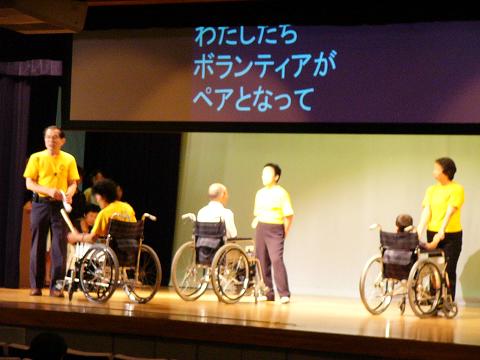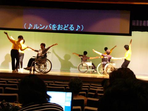 | 踊っているのは、車イスダンスグループ「矢車草」のみなさんです。車イスダンスは、音楽に合わせてダンスを踊るので、「♪ルンバをおどる♪」などの音楽に関しての状況説明も行っています。 |