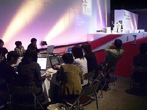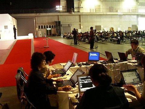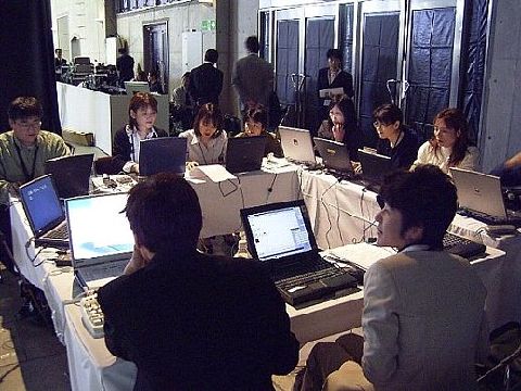 | 情報保障席は、中央に空間を作って四角にテーブルを並べています。大きな会場では、このように余裕のある配置を取ることができます。入力者も充分いて余裕が感じられる入力風景に見えますが、実際は、2人の司会者のかけ合いと、発表者数人の早口のディスカッションという非常に難しい入力だったそうです。 しかし、終了後に、司会の方から「すごいお仕事だと思う。今までこういうのがあるということを知りませんでした」という感想をもらったり、事務局から「とてもよかった。これなら、どこに出してもいいですね」と、とても評判が良かったとのことです。 |