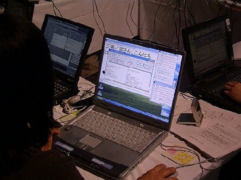 | 写真中央の青背景に白文字のパソコンが表示機です。手前の2台の入力機の画面が黒背景白文字と白背景黒文字と逆になっています。「見やすい画面」が人それぞれであるのが、この写真からも分かります。 |