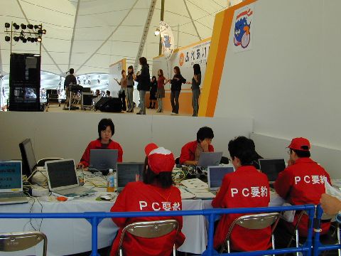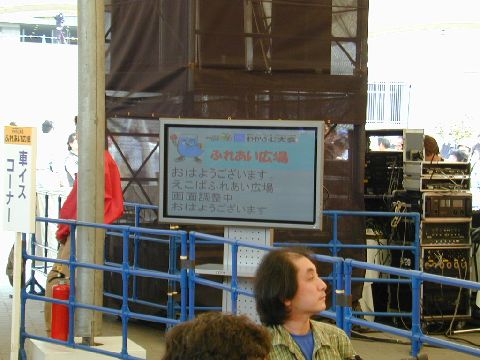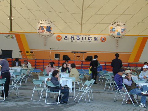 | ふれあい広場は、両側に食べ物屋があって、テーブルで食事をしながらステージを楽しむことができます。字幕は、ステージ両側の大型液晶ディスプレイに表示されます。この写真は、まだ準備中で少しの人しかいませんが、昼食時などは大混雑でした。 |