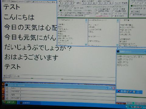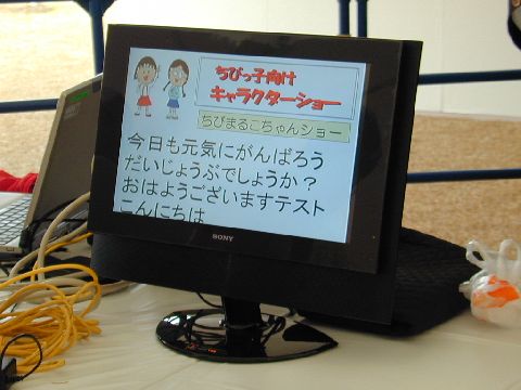 | 字幕は、4行×13桁で、白背景の黒文字です。画面上の「ふじっぴー」とタイトルはパワーポイントで作っています。合成や切替もパソコン要約筆記で行っています。上の写真のディスプレイの後ろはスピーカーで、その後ろが入力席です。 |
