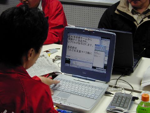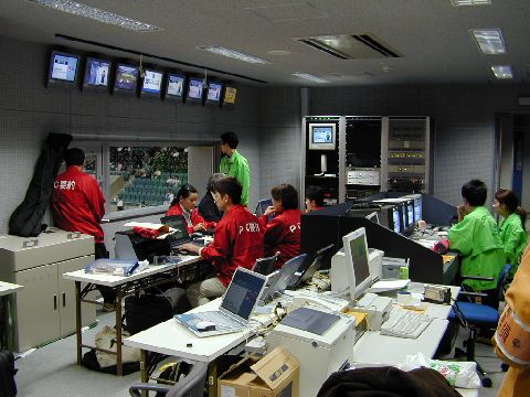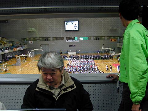 | 入力席は、放送室にあり、映像業者(緑のジャンパー)と同じ部屋のために連絡も密に行うことができます。競技と字幕を直接見ることができますが、入力はモニターで確認しています。 |