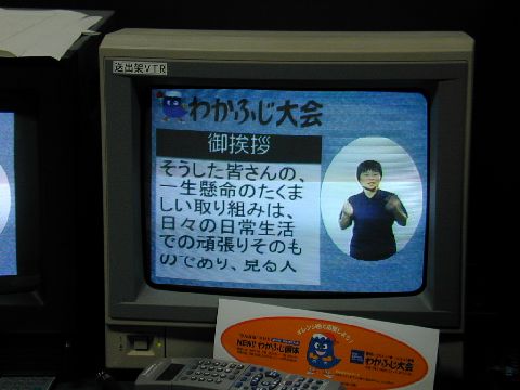 | RDSで背景画(フジッピー)とタイトル(黒背景の「御挨拶」)とIPtalkの字幕を合成しています。その画面に映像業者が手話を入れて表示します。 |