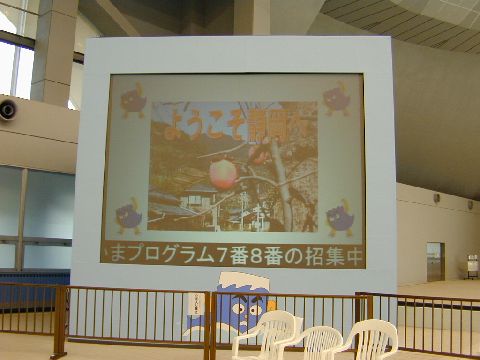 | 競技の無い時間には、パワーポイントのスライドショーを自動的に表示しまています。下には、IPtalkのテロップでお知らせを流しています。「パワーポイントより前面に表示」の機能を利用しています。 |