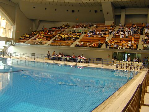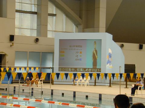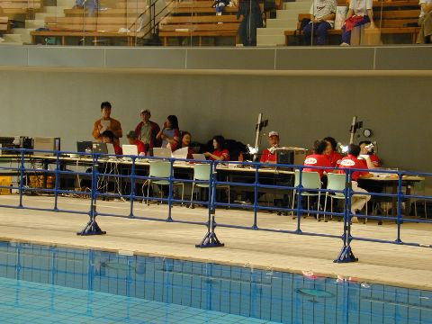 | 入力席は、プールのすぐ横です。競技の様子は直接見ることができますが、湿気が多くてパソコンには、あまり好ましくない環境です。 |