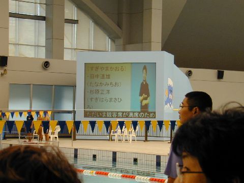| プールサイドに大型ピジョンがあるので、ライブ映像は入りません。上部に字幕、下にテロップを流し、右側に手話の画面を合成しています。 |