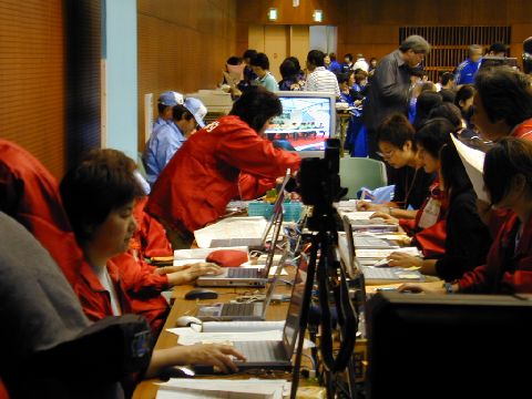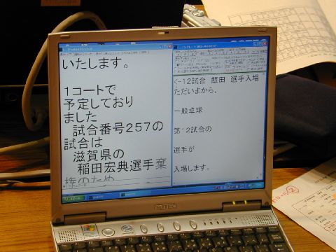| 入力席の様子です。次々と入ってくる試合結果をパワーポイントにして表示しなくてはいけないし、アナウンスを前ロール流したり、無いものはリアルタイム入力したりと大忙しです。 |