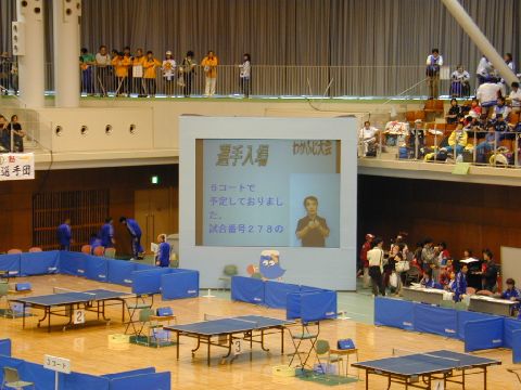 | 卓球場は、会場の角に投影型の大型ビジョンが設置されました。そのすぐ横がパソコン要約筆記の席です。会場の様子は見えますが、大型ビジョンの映像は直接見ることはできません。手話の撮影もすぐ横で行われています。 |