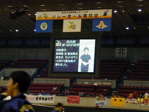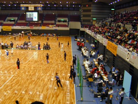 | パソコン要約筆記は、コートのすぐ横です。会場の様子も大型ビジョンの様子も分かる理想的な位置です。 |