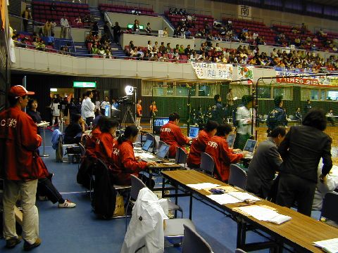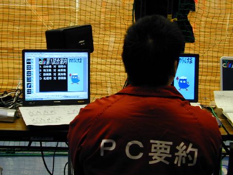| すぐ右がバレーボール協会の運営席で、大会の運営に関する指示はダイレクトに伝えられます。また、ボールがパソコンに当たらないようにネットを設置しています。 |