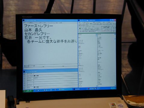 | 次の試合の案内などは、パワーポイントを使って表示します。パワーポイントを表示しているパソコンとIPtalkで字幕を表示しているパソコンは、切替機で切り替えます。 |