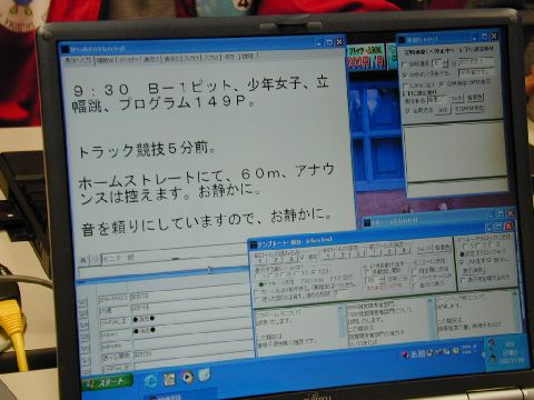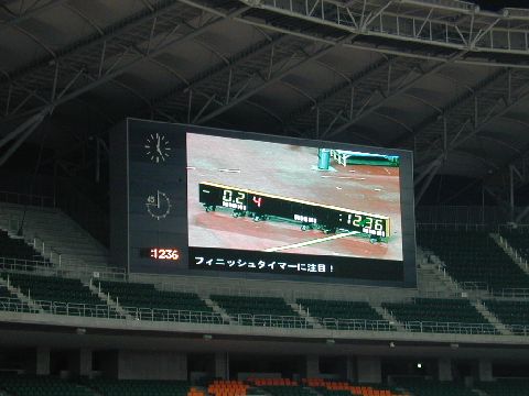 | これは、片足が義足の方の100m走の記録表示です。12秒36を出した力走に場内がどよめきました。アナウンサーが興奮気味に「フィニッシュタイマーに注目してください!」と叫んだ時の字幕です。感動を共有するために、リアルタイム入力は、常にスタンバイしている必要があります。 |