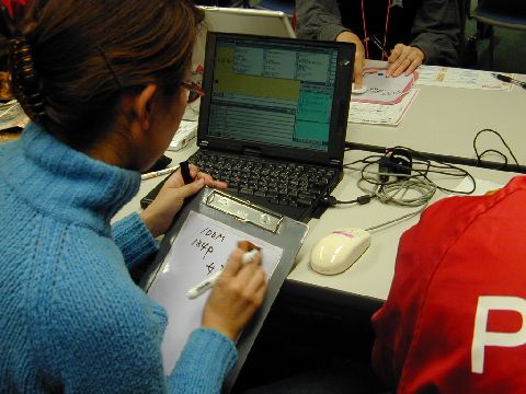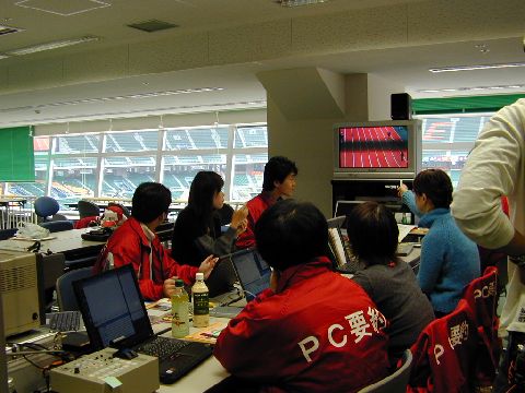| 入力席の様子です。表示はモニターで確認しています。開会式を乗り切ったパソコン要約筆記のメンバーには余裕が見えます。 |