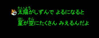 | 四日市市市立博物館で行われた字幕プラネタリウムの後半のアニメ「しまじろうの星空大冒険」の様子です。Sシリーズのスライド前ロールを使っています。ひらがなの表示を主にし、漢字を表示する場合はルビをつけています。フォントは26ポ、ルビのフォントは18ポです。 |