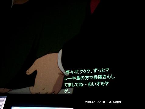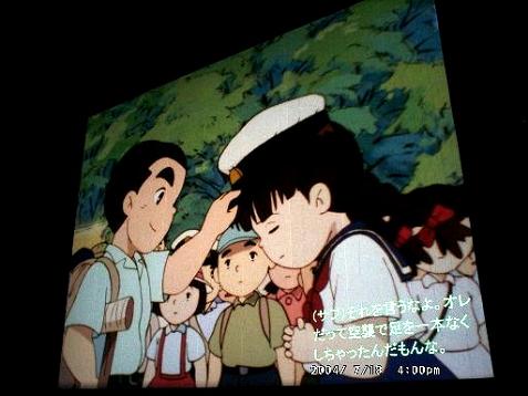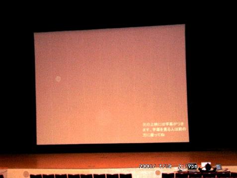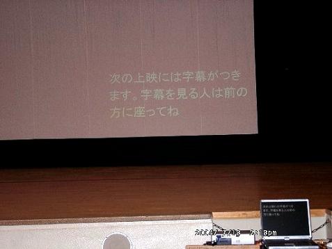| 最初は、縦書き3行表示で、スクリーン上に映画画面の横に表示することを考えて前ロールを準備していたのだそうです。しかし、リハーサルの段階で、右に出すのか、左なのかも決定できず、「当日は別にスクリーンが必要になるかも知れない」とか、「最悪、横の壁に出すようになるかもしれない」というような情況だったのだそうです。そこで、縦書き、横書き、右左にかかわらず、臨機応変に対応できるようにしておいたほうがいいと、覚悟を決めて本番に臨んだそうです。 そして、本番当日の会場のスクリーンははるかに大きく、横に出す事は暗幕の関係で無理という最悪の状況だったのですが、映画画面にダブらせて出しても良いと映画配給会社の許可が出て字幕が実現したのだそうです。 本番当日の上映は3回で、3回目だけに字幕を入れることになっていたので、1回目、2回目で1人が前ロールの訂正、もう1人は出すタイミングを練習したそうです。そして、3回目の本番では大きな失敗もなく、無事終えることが出来、ほっとしたとのことです。(よかった〜!(^^)パチパチ! ) |