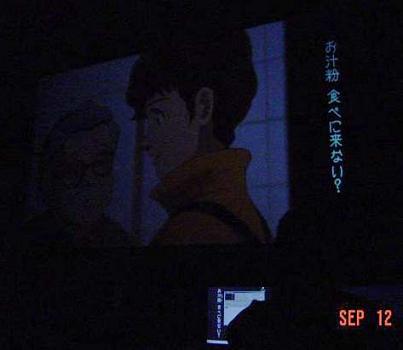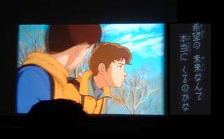 | 表示は黒バックの白文字で、ルビ付き縦書き2行です。フォントは「シネキャプション」というフリーフォントを使っています。このフォントは、映画らしくて良いと好評だったそうです。字幕は、映画の横のスクリーンに直接投影しています。写真では、字幕の黒バックがかすかに白く見えているいますが、画像処理しているためで、実際は見えません。 ふつうは字幕がつかない日本映画に字幕がつくと聞き駆けつけたというろうの方から「字幕のおかげでよくわかってたいへん良かった」と感想があるなど、大変好評だったとのことです。また、健聴の方からも、「字幕を見てより理解が深まった」という感想があったそうです。 |