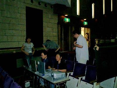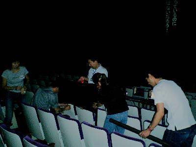 | 山形県県民会館は1500席の大きな会場です。3列目を取り外しテーブルを置いて、4列目に入力席を設置しています。表示用と字幕流し用パソコンの他に、トラブルがあった時のために予備のパソコンを1台用意しています。暗い場内ではパソコンの光がもれてじゃまにならないように黒い大きな紙でパソコンの回りを囲んだとのことです。 映画のシナリオをメンバー8人で手分けして入力し、「スライドエディタ」でスライド前ロールにしたそうです。8人で手分けしたため、、要約度や、語尾の処理等、担当者それぞれの個性が出て、それを統一するのに苦労したそうです。 字幕流しは、8人がそれぞれ自分で入力したパートを担当したそうです。 |