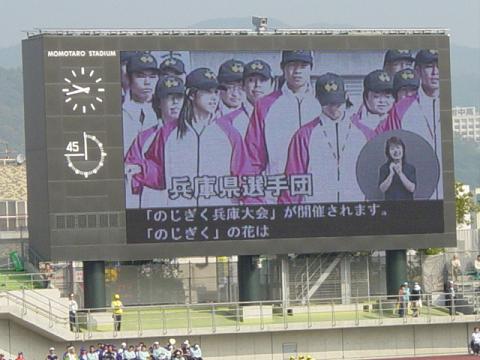 | 11月5日(土)から7日(月)に岡山県で「第5回全国障害者スポーツ大会」(輝いて!おかやま大会)が開催されました。次催県の兵庫選手団の入場行進を大型ビジョンで実況しています。ライブ映像の右下に手話を、下に黒バック白文字で2行20桁の字幕を表示しています。おかやま大会には、90人のパソコン要約筆記ボランティアが参加しました。 |