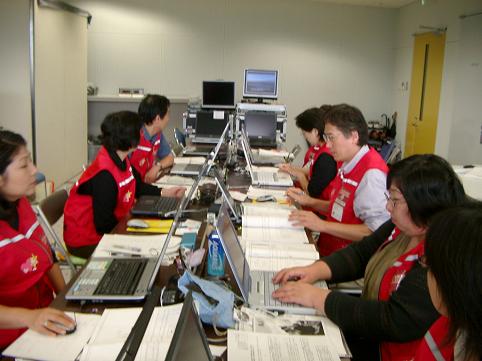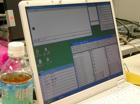 | 陸上競技の入力席の様子です。陸上競技連盟の方、そして、大型画面を制御される方と同じ部屋での作業でした。出場者の氏名などは前ロールで流します。競技記録などは、リアルタイムで入力します。机の向こう側のデスクトップパソコンは、大型画面と同じ映像ををモニターしています。柱にかかっているのが、当日の競技進行表です。 |