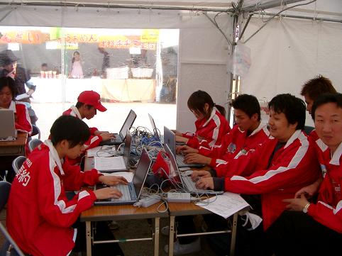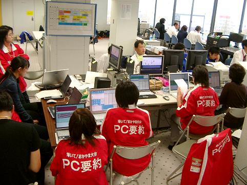| ふれあい広場の入力席の様子です。トークや物まねショーなど、リアルタイム入力をします。地元専門学校の協力も得て情報保障を行いました。若々しいメンバーによる4人連携入力のおかげで、早口の物まねショーも乗り切ることができました。ちなみに、屋外のテントの中での作業なので、ほこりがすごかったそうです。表示用については、1日が終わるとキーボードの上にうっすらほこりの層ができていたそうです。 |