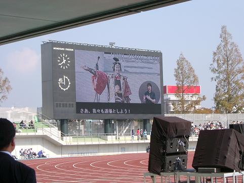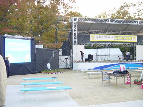| ふれあい広場の様子です。左側に大型ビジョンを設置しています。ふれあい広場の場合、大型液晶テレビでは小さくかつ屋外で文字が読みにくいということもあり、今回は車の荷台に画面がついている屋外中継用の車両の画面を使って表示させました。見易さはよかったのですが、解像度が低かったために、使用できる色が制限されました。 |