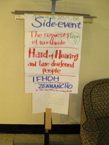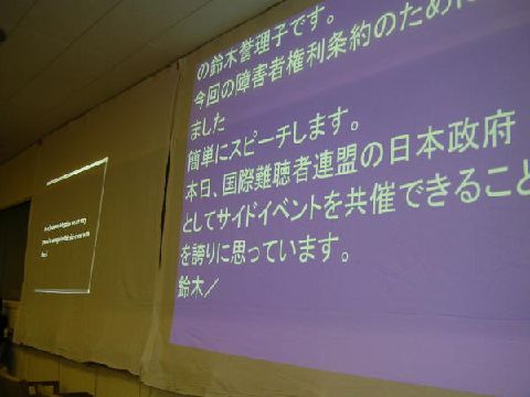 サイドイベントでは、瀬谷国際部部長の力作DVD、「難聴者、中途失聴者の要望」が上映され、文字情報、文字通訳、補聴援助システム、読話など、生活に密着したシーンの連続で終わると、参加者から期せずして拍手が起きたそうです。