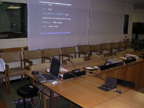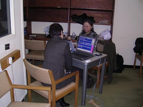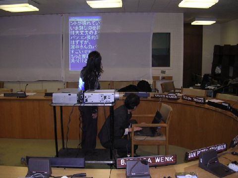 入力席は、同じ部屋のスクリーンの横、高岡さんと清成さんのすぐ後ろです。通訳の声は、インカムで聞き、入力します。高岡さんたちに近く、スクリーンの表示も確認できるので入力席は、良い位置と思います。