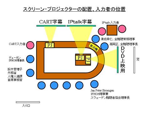 また、このように配置することで、高岡さんや清成さんが発表する時、発表者の後ろに、入力している要約筆記者と流れる字幕を、参加者は同時に見ることになります。文字による情報保障の必要性を訴えるサイドイベントとして、考え抜かれた配置と思います。