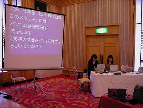 IPtalkの画面をそのままプロジェクターでスクリーンに投影しています。 開会前、機器接続が終わったので字幕の見やすさを確認しているところです。