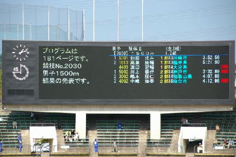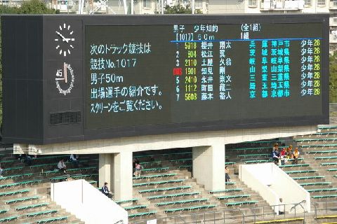 | 東側の横に長い大型ビジョンでは、左側1/3にパソコン要約筆記の字幕を表示し、右側2/3は陸協が表示する試合結果などを表示しています。 表示は6行×10桁です。 |