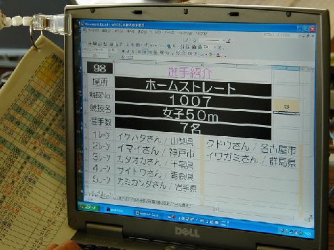| 競技Noを入れると競技場所、競技名、選手数、選手名、所属、プログラム掲載ページが出て来るようなエクセルの表を作り、すばやく確認します。 (説明文:高階さん) |
