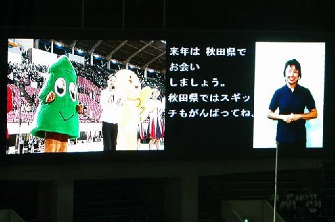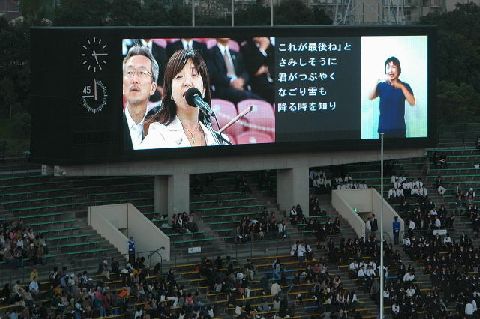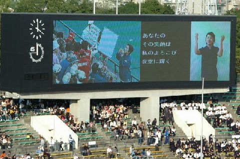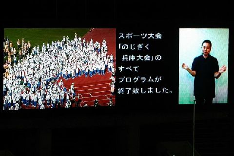 | 会場東側の大型ビジョンは、開会式と同じで、左半分がライブ映像、右半分が情報保障です。ライブ映像に情報保障席の要約筆記と手話が映っています。 |