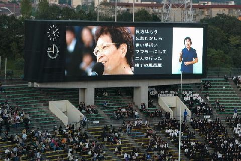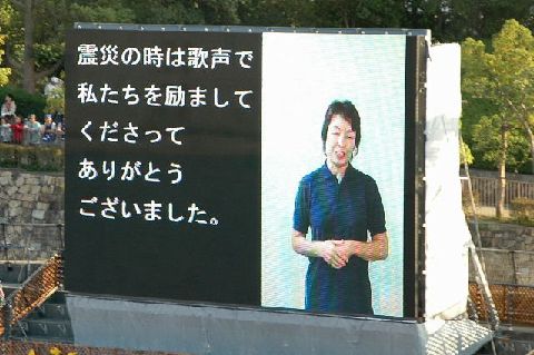 | ファイナルコンサートのイルカさん。歌は、「なごり雪」です。 この歌は、1998年神奈川ゆめ大会の閉会式でもイルカさんが歌い、歌詞の前ロールを流しました。のじぎく兵庫大会には、他県にもかかわらず、栗田も情報ボランティアとして参加させていただき、同じ閉会式で同じ歌を聴くことができました。8年前には、IPtalkをみなさんに使っていただけるようになるとは想像もしていなかったと、イルカさんのライブ映像とスクロールする字幕を見て、感慨深くなりました。 |