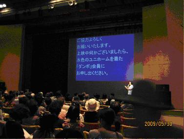 | 整理券を作成し、市内障害者団体や、ボランティアサークルなど配布後、市の社協が窓口となり、一般市民にも整理券配布しました。そのため、一般市民の観客も多く参加しました。 スクリーンの設定は以下のように行いました。 @7メートルのスクリーン中心に画像を映写 A画像の右端すぐのところに字幕を映写 B字幕は縦2行、文字はシネキャプションを使用 C1行のみ表示の際は、映画の画像に近いところに表示できるように、空行を挿入した D背景は黒色、文字色は白色 E時間表示を保存したので、上映会本番ではスタートを1回押しただけ 写真は、上映会前の注意事項説明しているところです。 約250人の来場者があり、客席は満員でした。 |