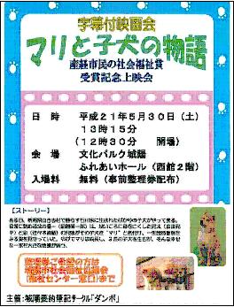 | 5月30日、城陽要約筆記サークル「ダンボ」では、「マリと子犬の物語」を字幕付きで上映しました。 この上映会は、2008年11月26日に大阪の新阪急ホテルでいただいた「第34回産経市民の福祉賞」の副賞の賞金を使いました。 |