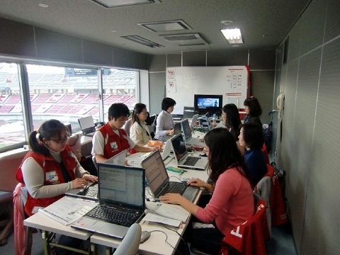 | 入力所はビッグスワンの「放送室2」で、会場の様子がよく見えました。 一番手前のパソコンは入力用予備機、一番奥にあるのが大型映像のモニターです。 表示機は窓際のカウンターに2台あります(白い紙のカバーをかけている)。 表示機は20文字×12行で、映像業者が最新の2行を大型映像に表出する設定にしていました。 そのため、表示機だけを見ていると、現在どこが表示されているのかわからなくなるので、2行だけ見えるようにカバーをかけました。 メンバーは、手前の4名が前ロール班、奥の4名がリアルタイム入力班。 その他、リーダーの要約筆記者が1名。 情報保障席には難聴協メンバー(記録ビデオ・写真撮影、大型映像画面チェック等担当)が2名おりました。難聴協メンバーには前ロール作成にも協力していただきました。 式典など、ほぼ前ロール通り進行する場面は前ロール班が担当し、オープニングプログラムなど、シナリオはあってもその通りに進まない場面は、前ロール流しも含めてリアル班が担当しました。 「(同じチャンネルの)他の入力班の全員に送信する」機能やテンプレート前ロールの連動、モニター機能などを活用しました。 本部等との情報伝達については、同室に映像業者の方が1名常駐しており、インカムからの指示や進行状況などを適宜伝えてくださいましたのであまり不都合はありませんでした。 |