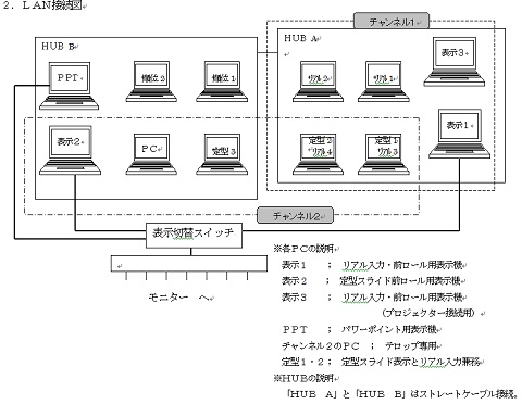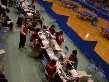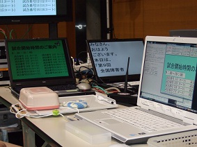 | 班構成は、音声情報が流れる時のリアル&前ロール担当(情報保障)と場内放送のないときの定型スライド画面担当(情報提供)と競技結果から順位を算出する順位担当の3班に分けました。リアル班は基本2名ですが、緊急時の対応としてスライド班の3名の内2名がリアル班を兼務しました。このため、チャンネル1にリアル班のIPtalkを起動し、チャンネル2に定型スライド画面用のIPtalkを起動しました。リアル班と定型スライド班を兼務する2名はチャンネル1とチャンネル2に2つのIPtalkを起動して、適宜何れかのIPtalkを切替えながら入力を行ないました。 リアル班は、開始式・表彰式・閉会式の前ロール、お知らせなどを流しました。最初に、放送係のインカムに放送指示の連絡が入り、放送内容の準備をしているところに、具体的な内容が競技連盟から持ち込まれるので、放送指示があってから放送を行なうまでの時間を短くすることができました。 定型スライド班は、ブロックごとに行なわれる試合開始時間や試合結果を定型スライド前ロールで表示すると共に、場内へのお知らせ(フラッシュ撮影の禁止、選手召集案内、落し物連絡等)を場内放送の前ロールが流れ終わった後に、情報提供とて定型スライド前ロールで表示しました。 順位算出班は、対戦結果表が回ってきた時点でブロックごとの試合結果をエクセルに入力し、勝ち点の計算をしました。ブロック内の全ての試合結果を入力し終わると、該当するブロックの表彰式用前ロールを作成するのですが、表彰式の直前まで行なわれる試合もあり、表彰式用前ロールの作成は、かなり冷や冷やものでした。 表彰式や閉会式では、選手が競技会場へ移動するため、観覧席に設置されたモニターでは情報保障ができないため、競技会場内にスクリーンを立て、表示機(LAN接続図の「表示3」)とプロジェクターも競技会場内に移動して設営しました。 しかし、準備時間が短い(20分~30分)ため、迅速で確実な設営が必要でした。 |