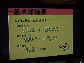 | 「試合開始時間のお知らせ」と「一般卓球の試合結果」を表示しているところです。 試合結果画面の赤いところはテロップを流しています。 |