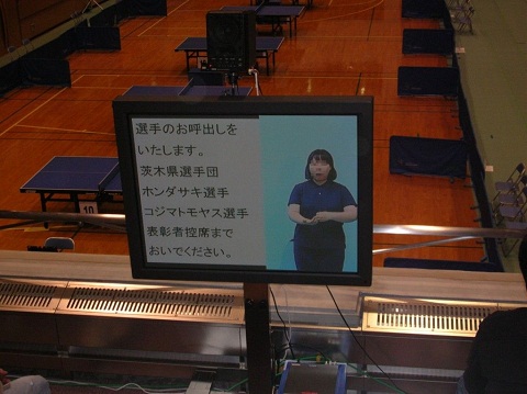 | 競技会場の側面に競技連盟・放送係・PC要約・手話の順に並んでいます。 大型モニターの設置は無く、40インチモニターが観覧席に6台、選手召集所に1台設置されています。 アナウンス指示は、放送席にまず届きますが、インカムで事前に放送内容が分かるので迅速に放送内容の準備ができました。 表示画面の切替は映像業者にお願いしましたが、画面切替のタイミングをすぐに掴んで頂きチームワークの取れた情報保障・情報提供ができました。 |