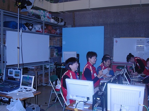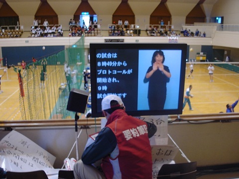 | 体育館の用具庫を作業スペースに充ててもらいました。 要約筆記と手話が同じ場所でやることで、事前の資料も共有し、アナウンス、要約筆記、手話が同時に進行できました。 |