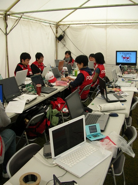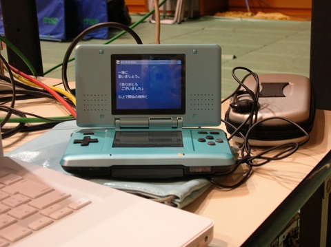 | また、試行的ではありましたが、ITBCを使ったPSP等への無線配信も実施しました。 県聴覚障害者情報センター等の協力により、県内聴覚障害者への周知を行い、県内の関係者のみへの案内でしたが、文字部分の情報保障を大会期間中、終日配信し続けました。 PSP、DS、iPhoneなど、同時に受信したのを確認できたのは最大で5台ほどと少なかったですが、受信範囲が想定以上に狭かったこと、また、屋外での使用のために明るくて画面が見づらかったことなど課題は残したものの、おおむね良好に配信を行えました。 |