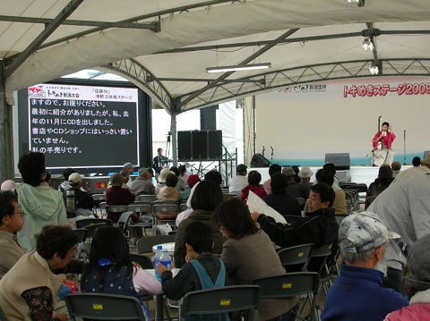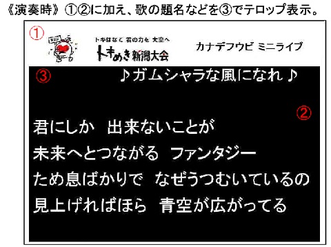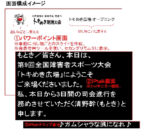 | 「トキめき広場」は、他県では一般的に「ふれあい広場」と呼ばれている催しです。トキめき広場の要約筆記班は、その中のステージアトラクションのみを担当し、式典チームからの応援を含め、総勢11人でした。 メイン会場である東北電力ビッグスワン脇の「カナール広場」というところに特設のステージを設置し、その横の大型LEDビジョンに情報を表示しました。 |