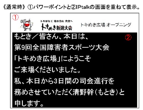 | 情報保障画面は、IPtalkの2ndモニター機能、パワーポイントの発表者用ツールを使い、大型ビジョンには、セカンダリモニタの画面を表示。 |