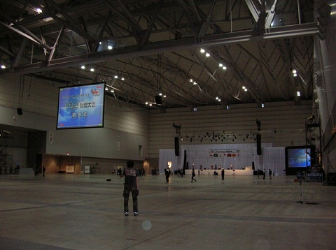 | 閉会式は新潟市の朱鷺メッセで行われました。 前日の設営の様子です。 大型スクリーンをステージ横に1台設置し、もう1台を会場中央付近の天井からつり下げていました。 |