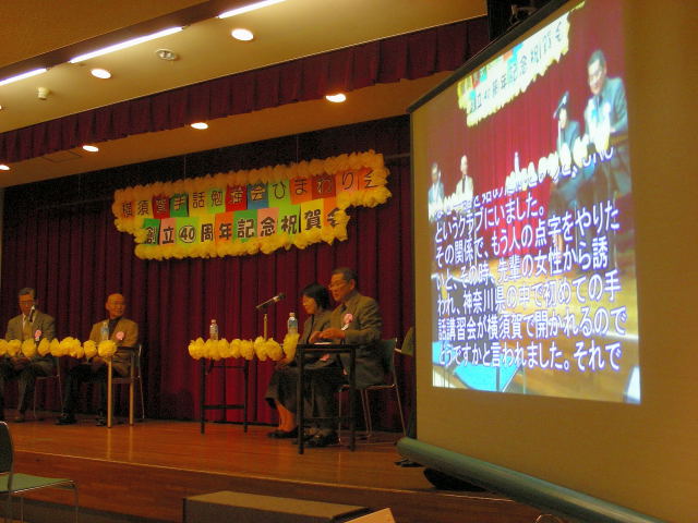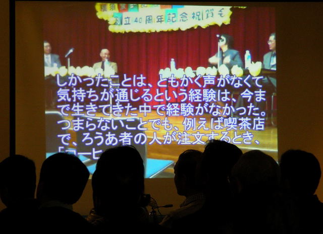 | 記念講演では、ひまわり会の設立当時の会員が、当時の思い出を話しました。舞台右側にスクリーンを設置し、ライブ映像とパソコン文字通訳を合成して表示しました。 |