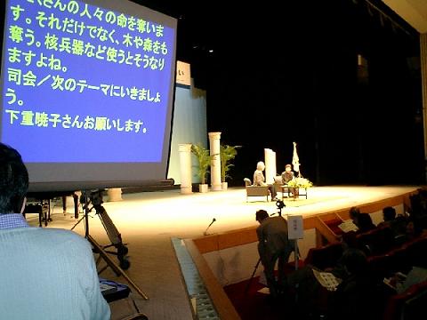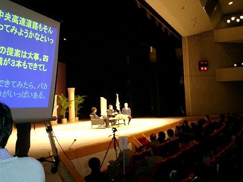 | 出演者の一人の俵万智さんは、自分の出番で短歌を引用する時に字幕に出して欲しいと、わざわざパソコン要約筆記席にメモを持ってこられたそうです。希望とおり「い」を「ゐ」にして前ロールを作り、短歌の引用の時に前ロールを流して対応したとのことです。 写真は、猪瀬直樹さん、新井満さんのトークの後に、高橋山形県知事が飛び入りで加わった時の様子。 (字幕の下段の色が変わって見えますが同じ白文字です。) |